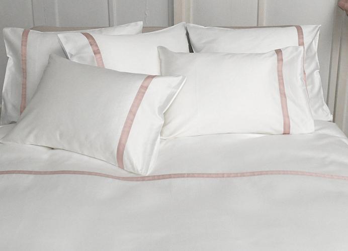 Stijlvol en simpel. Deze dekbedovertrek geeft je een beetje het gevoel dat je in een luxueuze hotelkamer vertoeft. Gemaakt uit 100% katoensatijn, mooi wit en strak maar afgewerkt met een kleurrijk detail. De gekleurde ribbon is mogelijk in verschillende kleuren.