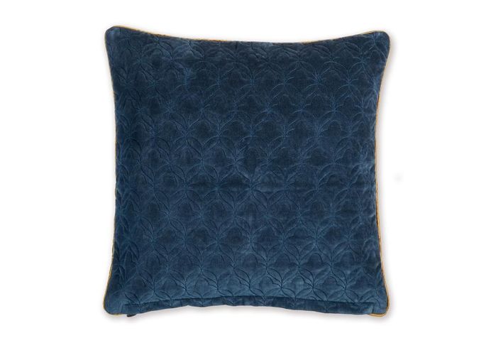 Het sierkussen is langs twee kanten doorgestikt met een tulpenpatroon. De voorkant is in geel fluweel en de achterkant in blauw fluweel. Een ideaal kussen voor een leuke mix and match in het interieur. | € 39.95
